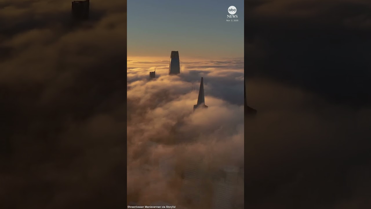 Aerial footage shows fog rolling into San Francisco’s Bay Area, with the tops of buildings and bridges peeking out from